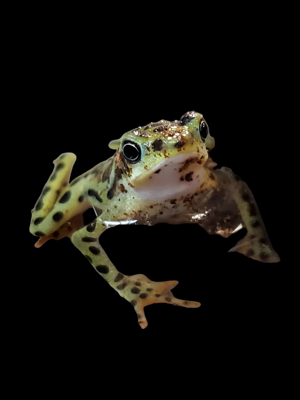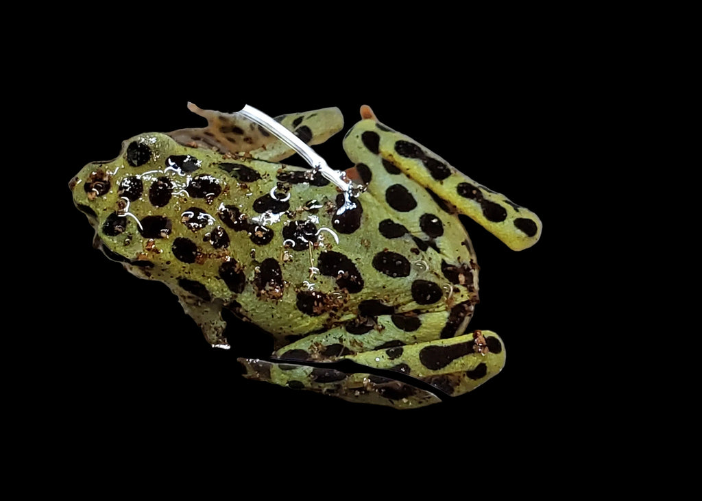 Appearance: The Rio Pescado Stubfoot Toad is a stunning member of the Atelopus genus, displaying vivid colouration in the warm yellow tones with black spots. These colours differentiate them from the purple and pink harlequin members of the atelopus family. The skin is smooth and glossy rather than warty. The body is slender and angular, with long, delicate limbs adapted for agile movement along rocks and stream edges. The underside is creamy colors, ranging into whites. Their appearance is highly variable but always visually dramatic.