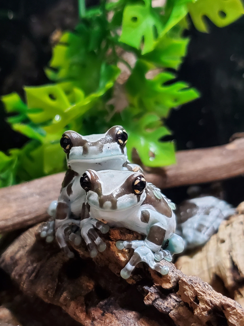 Appearance: Amazon Milk Frogs are striking arboreal amphibians with a pale grey to bluish-grey base colour contrasted by bold chocolate-brown banding or blotches. As they mature, their skin develops a powdery “milky” texture, inspiring their common name. Their bodies are sturdy, with slightly granular skin, large adhesive toe pads, and expressive golden eyes with horizontal pupils.