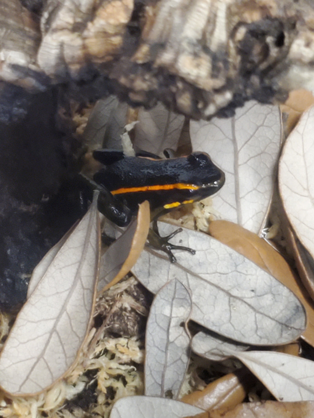Ameerega trivittata lays terrestrial eggs, which the males take care of. The eggs are kept in clutches that are hidden under fallen leaves. The males transport the tadpoles to a suitable water source outside of the range of the male territory after they have hatched. In nature, it takes about 14 to 17 days to go from fertilization to hatching, and another 41 to 54 days after hatching to reach metamorphosis.