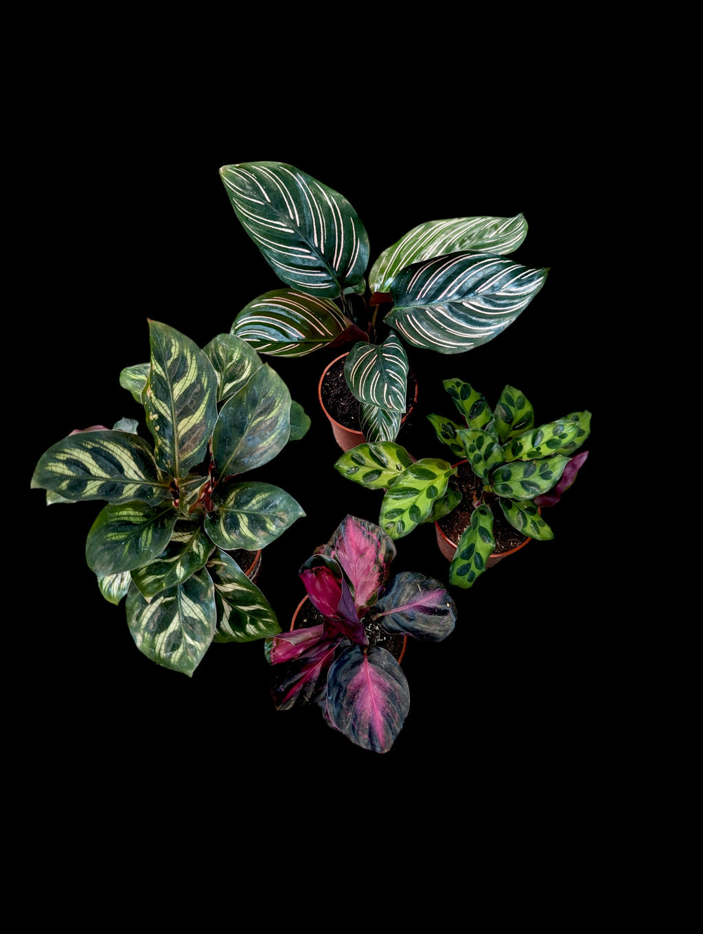 A variety of Calatheas including rattlesnake, vittata, roseopicta and zebrina.