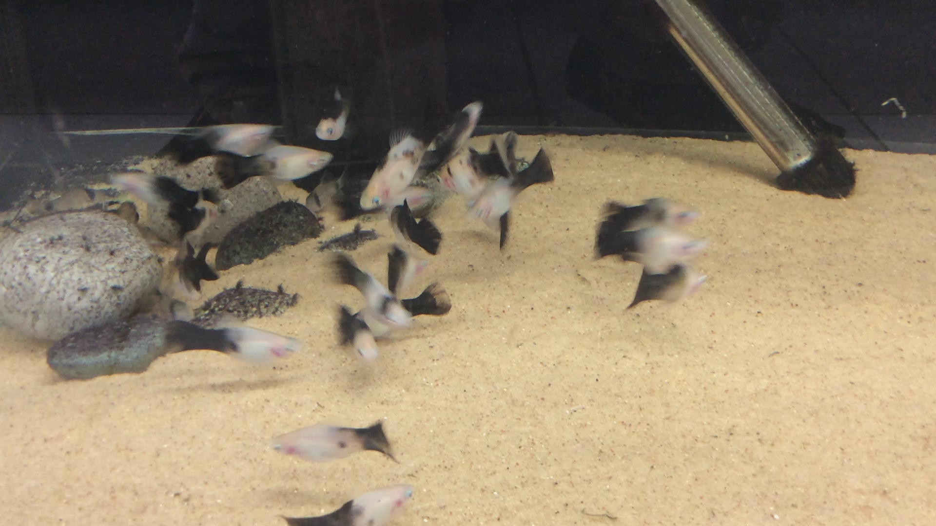 These are panda platies, with almost perfect separation between a white front half and black tail. They're currently around 1-1.5" long.