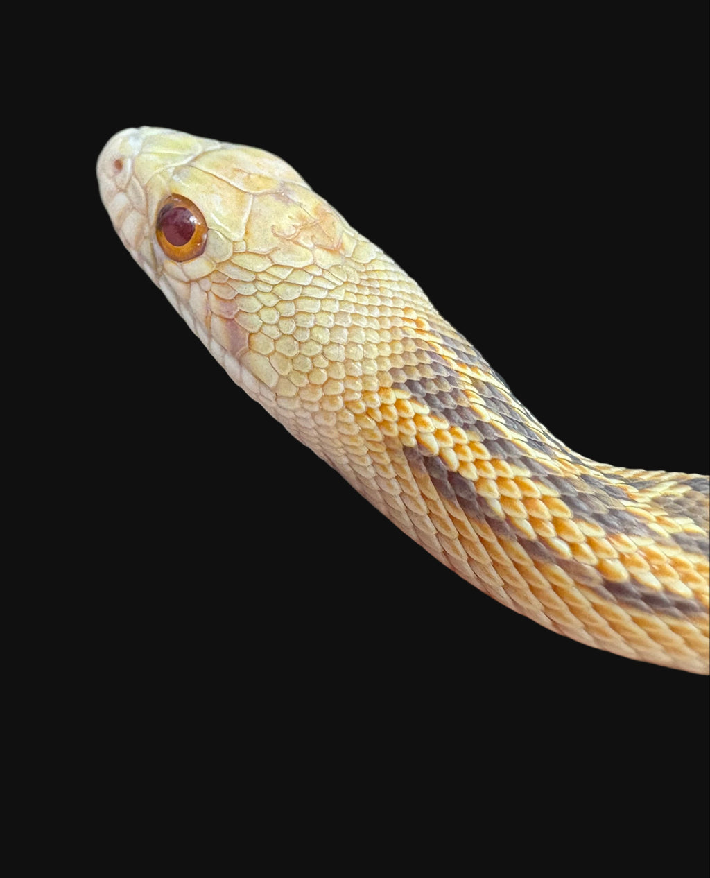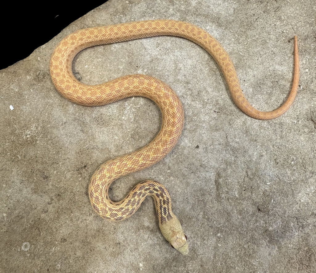 Appearance: The Extreme Albino San Diego Gopher Snake is a vivid, high-intensity expression of the Albino morph, selectively bred for maximum saturation and contrast. The Albino gene removes dark pigment, revealing bright yellows, golds, and oranges; in the Extreme line, these warm tones are amplified to near-fluorescent levels. The dorsal blotches are deep orange to red-orange against a creamy white background, and the eyes are ruby-red. This morph is particularly stunning under natural sunlight, where its warm tones seem to glow. The combination of the San Diego subspecies’ naturally rich pigmentation and selective enhancement makes the Extreme Albino one of the most visually dynamic Pituophis ever produced.